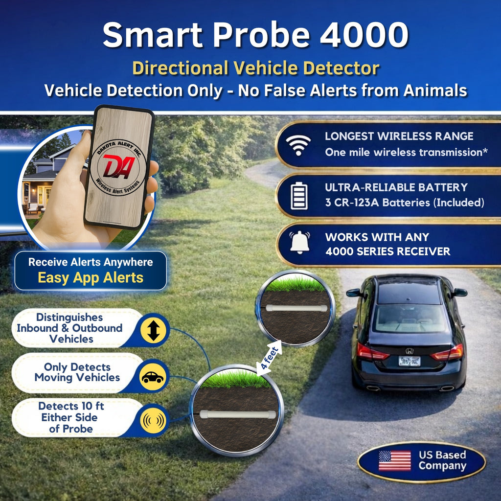Designed for outdoor deployment and can work up to 1 mile away from the indoor plug-in receiver in conditions from -30°F to 110°F—with the longest wireless range in its class, the Dakota Alert DUAL-SR4000 kit is a hassle-free wireless driveway detection system that goes the distance.